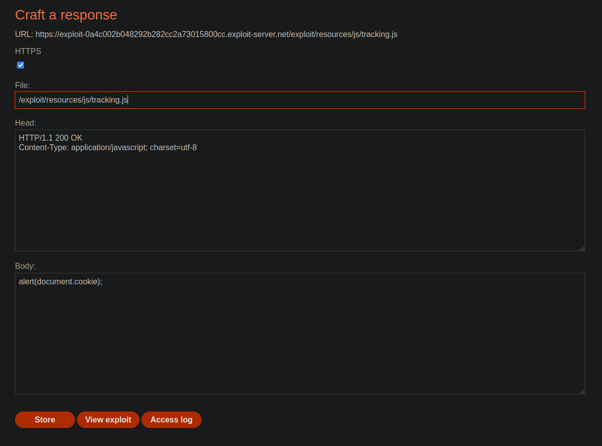As we can see, we can redirect to any domain we want. All we have to do now is to host a script that executes alert(document.cookie) on the exploit server at the path /exploit/resources/js/tracking.js and change the redirect domain to the exploit server’s. This way, whenever a user tries to import the tracking.js script they will instead load our malicious script: