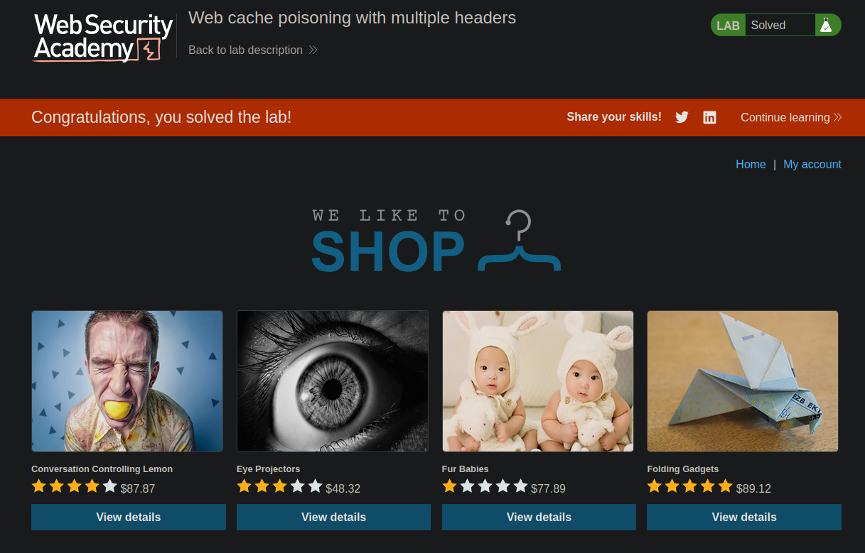 This lab contains a web cache poisoning vulnerability that is only exploitable when you use multiple headers to craft a malicious request. A user visits the home page roughly once a minute. To solve this lab, poison the cache with a response that executes alert(document.cookie) in the visitor’s browser.