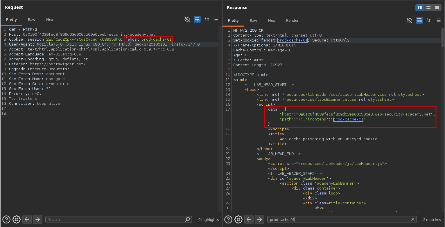 Intercepting the request to the homepage, we find a cookie fehost=prod-cache-01 which is reflected in the response inside a javascript object: