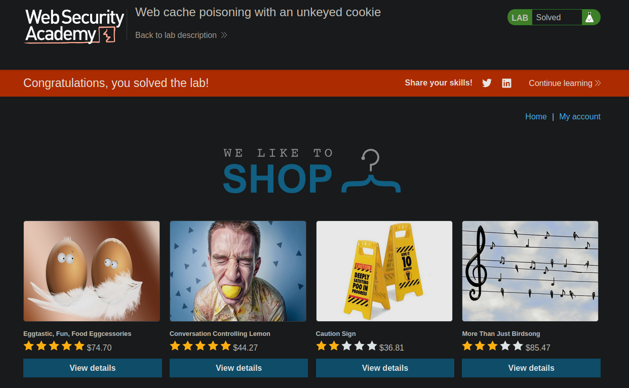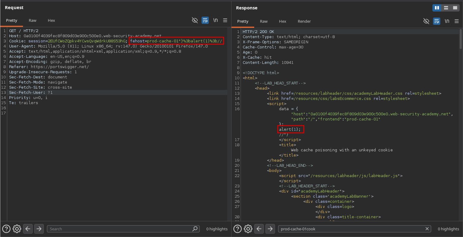 This lab is vulnerable to web cache poisoning because cookies aren’t included in the cache key. An unsuspecting user regularly visits the site’s home page. To solve this lab, poison the cache with a response that executes alert(1) in the visitor’s browser.